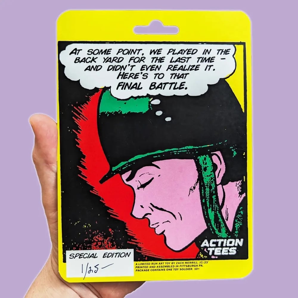 Full color glossy 5x7" heavyweight stock backing card with classic army action toy. Packaging assembled and designed in studio using reworked 1950s comic art. Special edition - each hand numbered. A variety of three figures. One chosen randomly per order. Orders ship within one week of purchase.