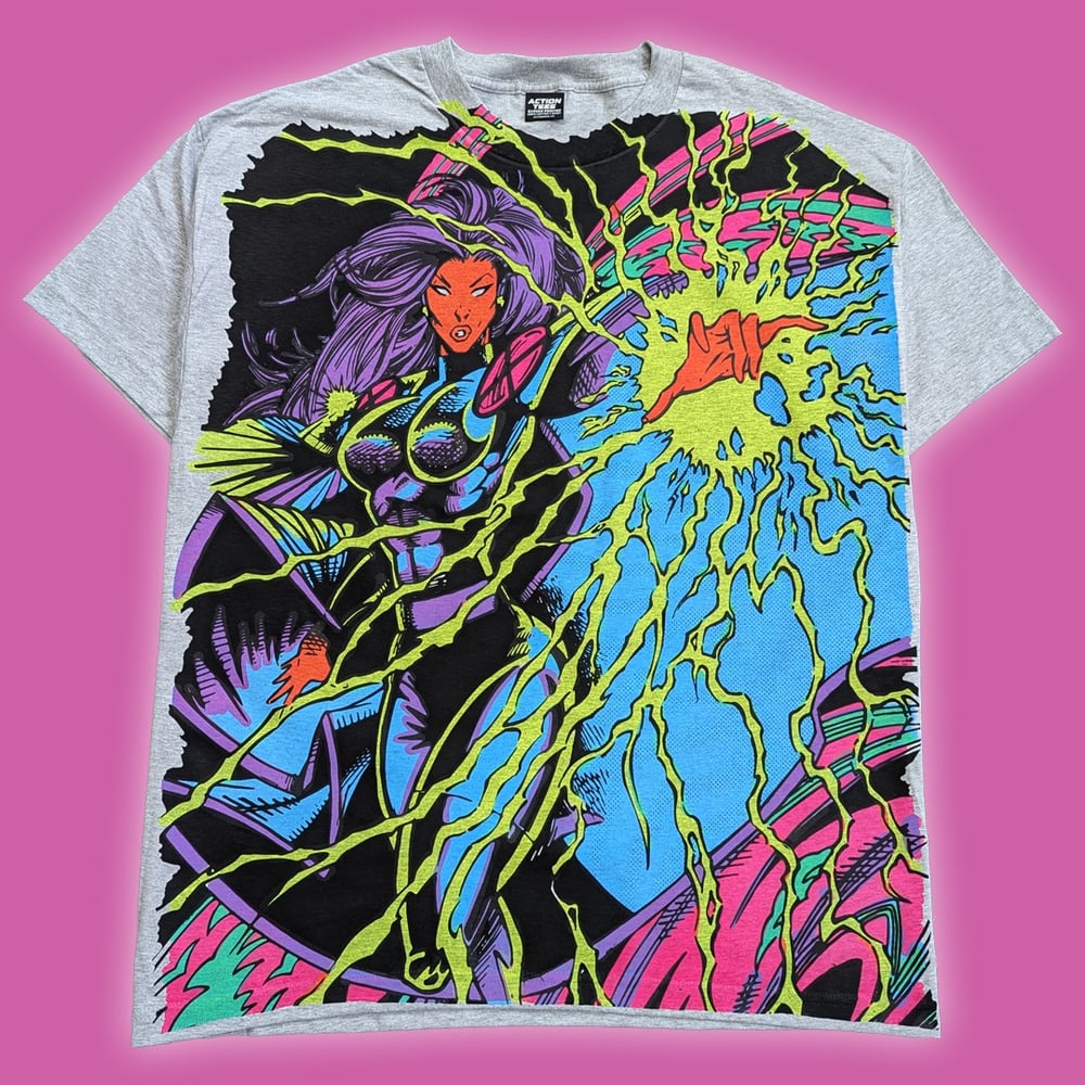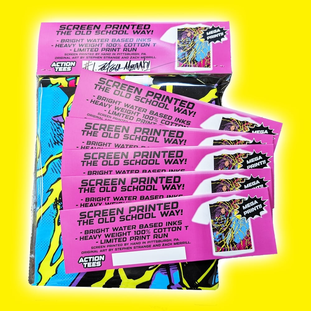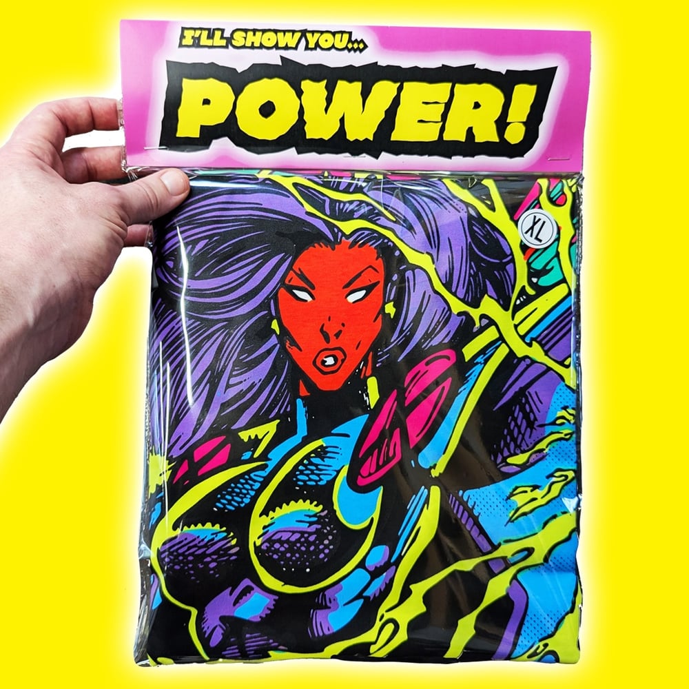This is a pre-order for I'll show you Power! T-shirt. Limited run. Available for 48 hours ONLY. Orders ship within three / four weeks of pre-order close. Each shirt comes with hand signed and numbered glossy header card as shown. Screen printed traditionally in studio using highest quality water based inks for a classic look and feel. Printed on soft and durable 100% cotton ring spun 6+ oz. heavyweight blanks. (Grey T is 90/10 cotton blend.) 4 color MEGA front print. Fluorescent inks plus multiple color blends. + Woven neck label. Ships in Action Tees screen printed padded mailer. Original pencil and inks by Stephen Strange. Edits/vector/color by Zach Merrill.