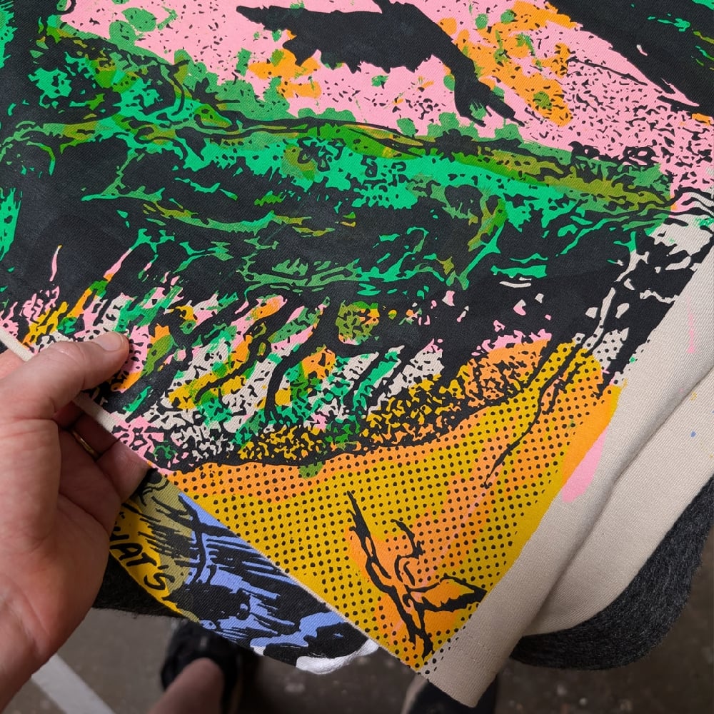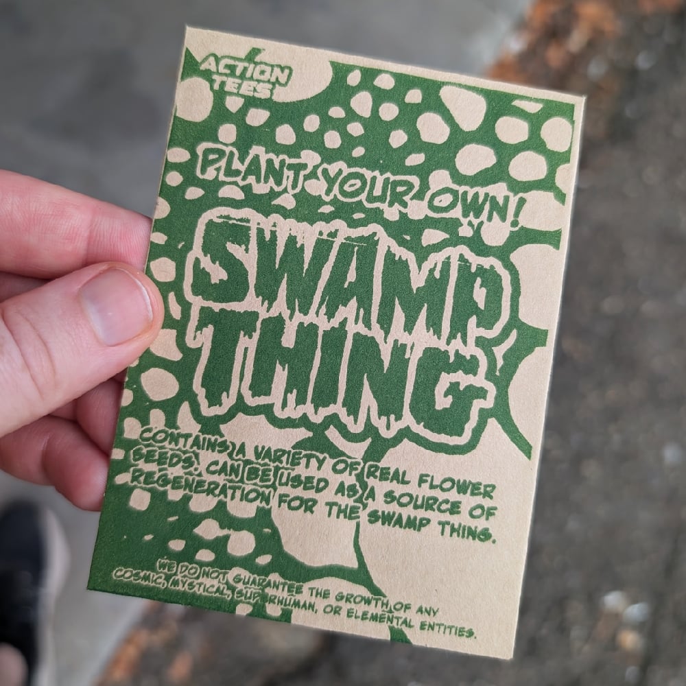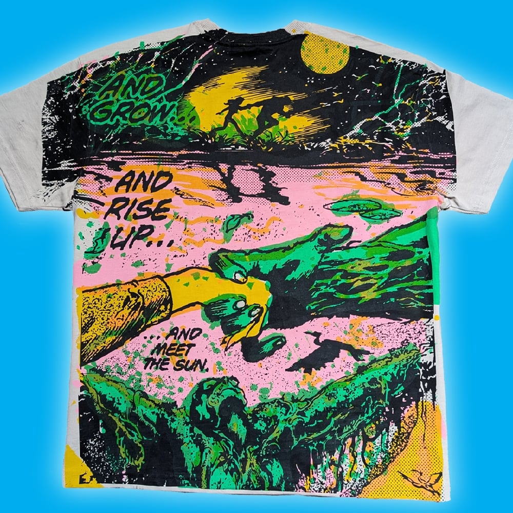 This is a pre-order for Into The Green T-shirt. Limited run. Available for 48 hours ONLY. Orders ship within four / five weeks of pre-order close. Available in natural color T with bonus screen printed seed packet. Screen printed traditionally in studio using highest quality water based inks for a classic look and feel. Printed on soft and durable cotton blend ring spun 9 oz. heavyweight blanks. Sizes above 3X printed on 6 oz 100% cotton ring spun T's. Four color mega front print and four color mega back print with multiple blends. + woven neck label. Ships in Action Tees screen printed padded mailer. All registered trademarks & copyrights are property of respective owners. Action Tees does not claim ownership of characters. Small batch limited print runs only. This is a collage of reworked elements, hand drawing, vectored, toned, textured and colored of various parts and pieces from Saga Of The Swamp Thing Book One. Original pencils by Stephen Bissette. Inked by John Totleben. Colored by Tatjana Wood. Written by Alan Moore. 1983.