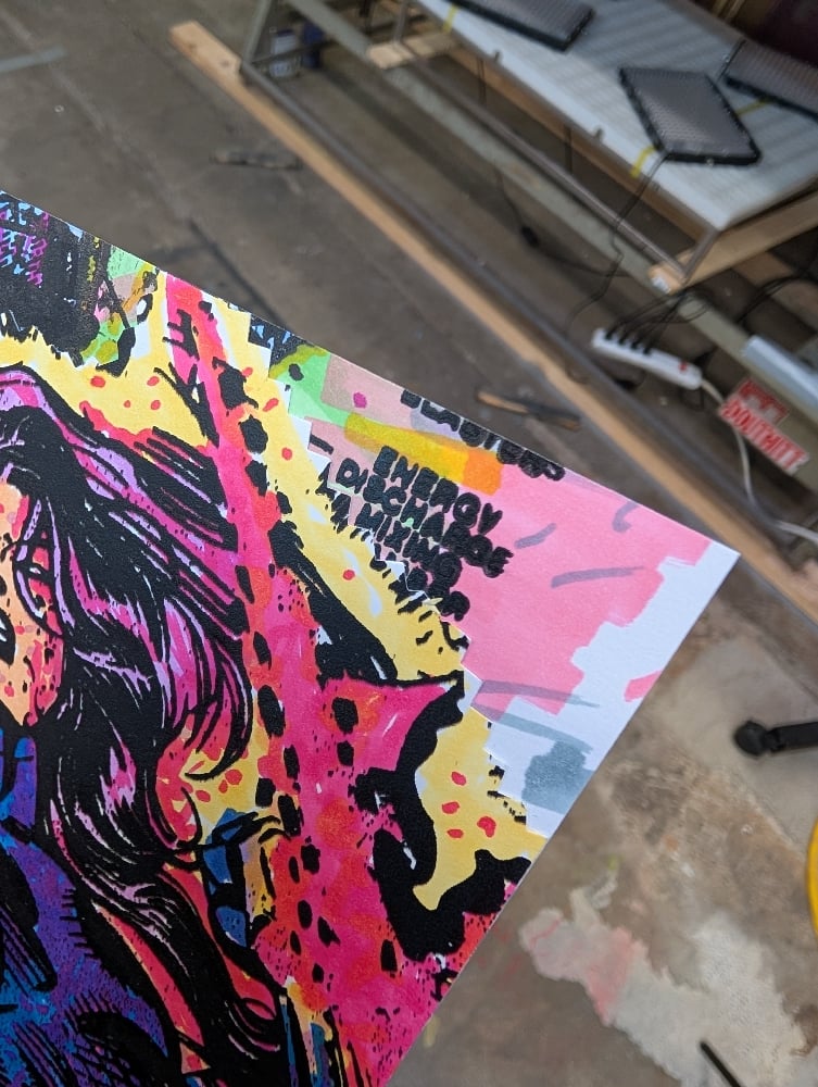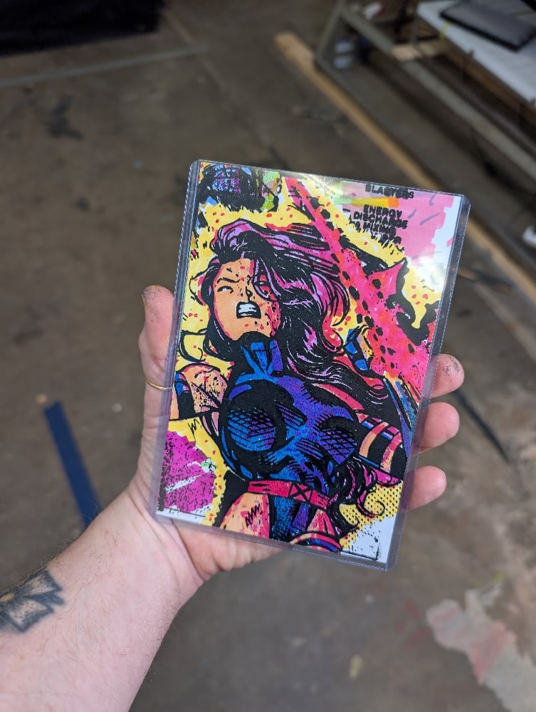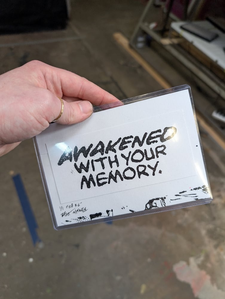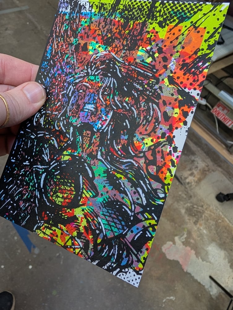 Digital + analog collage. Screen printed with individual hand coloring. Packaged in plastic top loader sleeve. Print number corresponds to photo. (photo 1 is print #1 etc) Two jumbo cards available. Each unique. Signed and numbered. Approx 5x7" Ships in stay flay ridgid mailer.