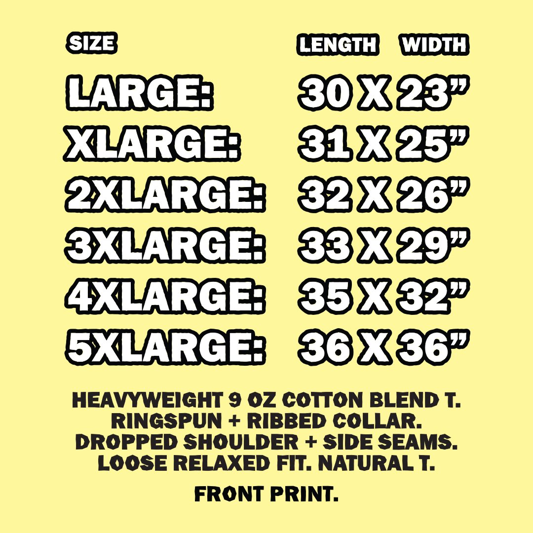 Screen printed traditionally in studio using highest quality water based inks for a classic look and feel. Printed on soft and durable cotton blend ring spun 9 oz. heavyweight blanks. Sizes above 3X printed on 6 oz 100% cotton ring spun T's. Four color mega front print with multiple blends.