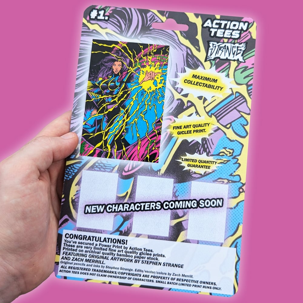 The *first* Power Print! Limited run of 50 pieces ONLY. Single prints ship within two weeks of order. Three/four weeks of pre-order close if purchased with T-shirt. Museum quality giclee Print. Printed locally on archival bamboo paper stock. Hand numbered/signed backing card assembled by hand in studio. Print displayed in clear 4x6 top loader protective sleeve. Ships in Action Tees screen printed rigid stay flat mailer. Original pencil and inks by Stephen Strange. Edits/vector/color by Zach Merrill.